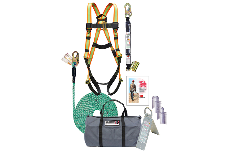 MAX-V Fall Protection Kit, 25′ Maxima™ 5/8″ diameter 3-Strand Vertical Lifeline with Snaphook, Value Harness Hi-Viz Universal Fit, Hinge-2™ Reusable Anchor with 36ea 3″ Duplex 16d Nails, Max-Force™ Energy Absorber with Snaphook and Integral Adjuster Rope Grab, and Convenient Gray Carry Bag