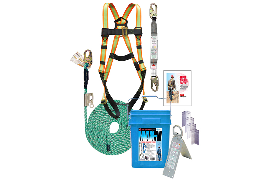 MAX-V Fall Protection Kit, 25′ Maxima™ 5/8″ diameter 3-Strand Vertical Lifeline with Snaphook, Value Harness Hi-Viz Universal Fit, Max-Force™ Energy Absorber with Two Snaphooks, Integral Adjuster Rope Grab, Hinge-2™ Reusable Anchor with 36ea 3″ Duplex 16d Nails, and Convenient Blue Storage Bucket