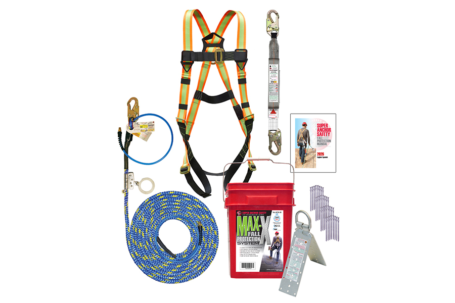 MAX-X Fall Protection Kit, 50′ X-Line 5/8″ Diameter 12-Strand Pneumatic Vertical Lifeline with Snaphook with Fall Arrester Panic Grab (ADP type) Rope Grab, Value Harness Hi-Viz Universal Fit, Max-Force™ Energy Absorber with 2 Snaphooks, Hinge-2™ Reusable Anchor with 36ea 3″ Duplex 16d Nails, and Convenient Red Storage Bucket